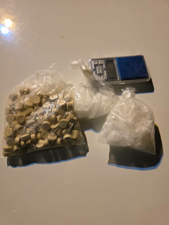 ​Three clear plastic packets containing tablets suspected to be Mandrax, with an estimated street value of R7,000, a crystal-clear substance suspected to be Crystal Meth, with an estimated street value of R10,000, and a small digital scale.