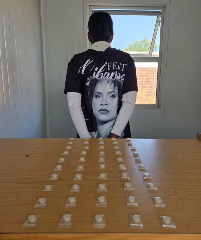 On Tuesday, October 21, 2025, police allegedly received a tip regarding a woman who may have been transporting drugs to an inmate awaiting trial at court. Welkom Crime Intelligence and the Welkom Anti-Gang Unit operationalized the information. The alleged suspect was seen at Weeber Street while investigating the information. Permission to search was requested and granted. A thorough search of the alleged suspect was conducted privately. The female was discovered to be in possession of mandrax tablets, which were found concealed on her body. The drugs were found wrapped with plastic and placed inside a sock.